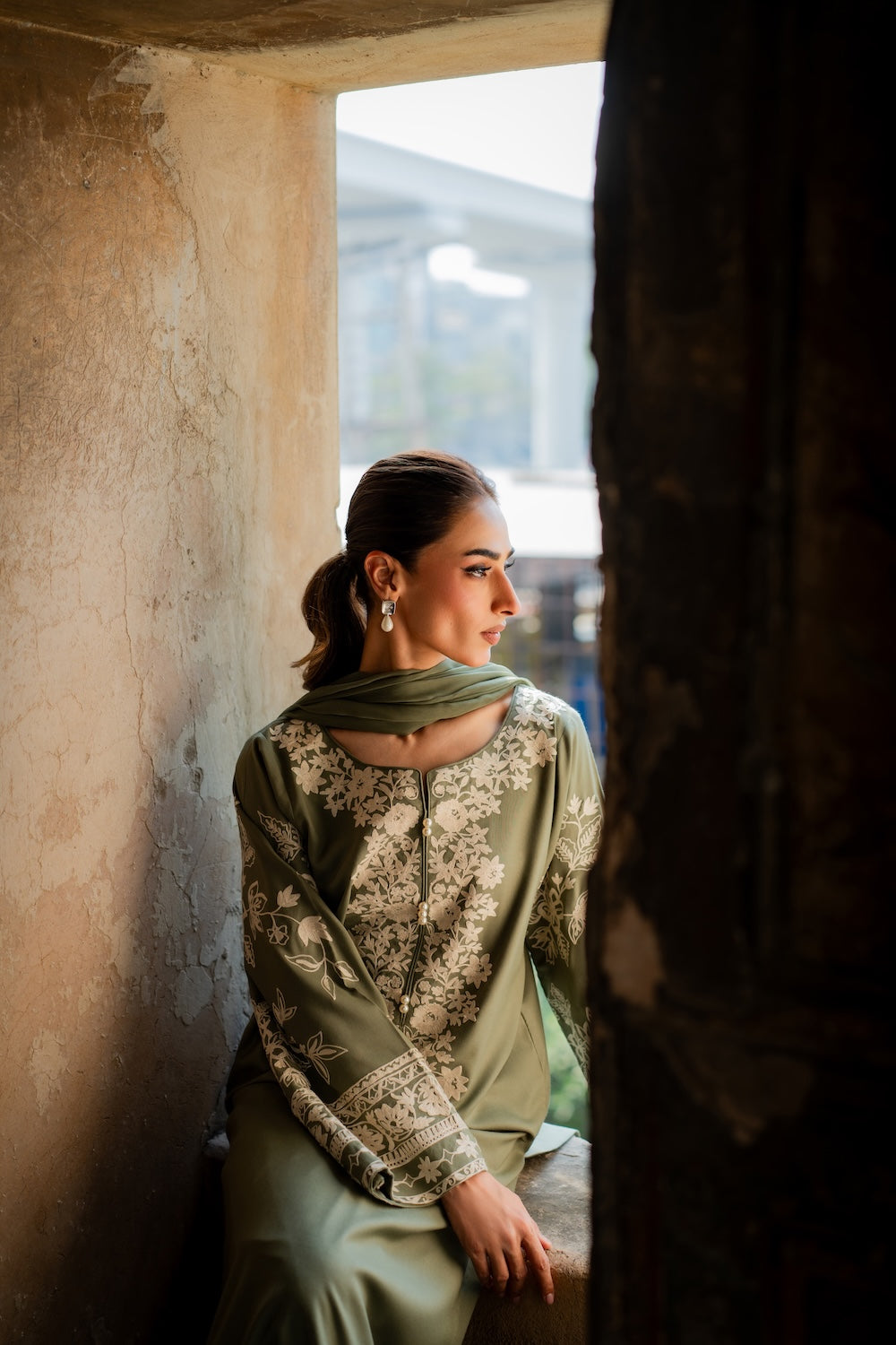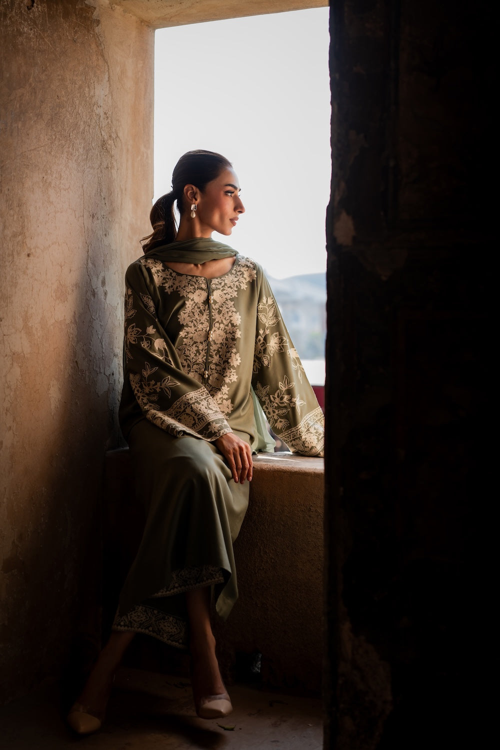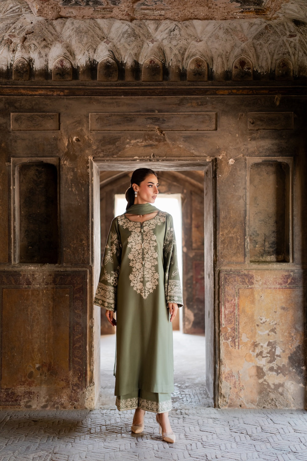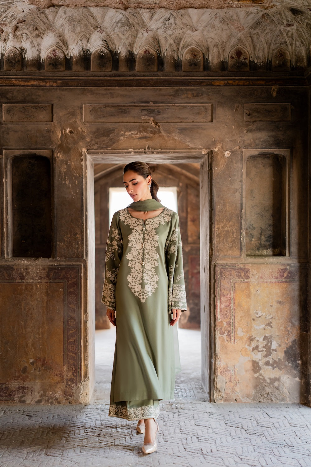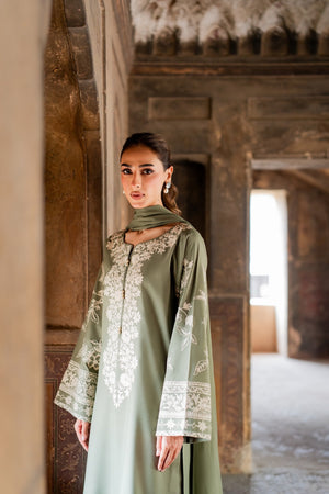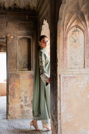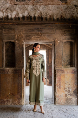 The Abroo set is a graceful 2-piece ensemble in soothing sage green, delicately adorned with intricate hand-aari embroidery for a timeless charm. The set includes a straight-cut kurta and embroidered culottes, both crafted in soft karandi fabric for all-day comfort.