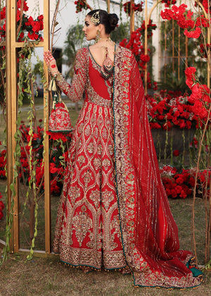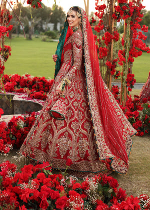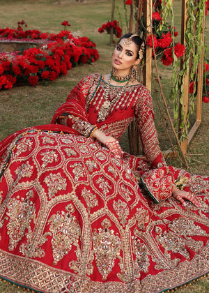 Make a statement with this vision in Red. The organza peshwas is lined delicately with silk layered with raw silk structured Lehngha along with sequins, tilla, kora, dabka and original emerald and ruby to elevate the look. Flooring gracefully is the roaring red structured pishwas and matching Dupatta