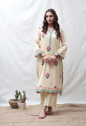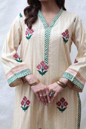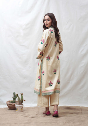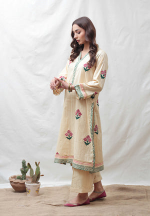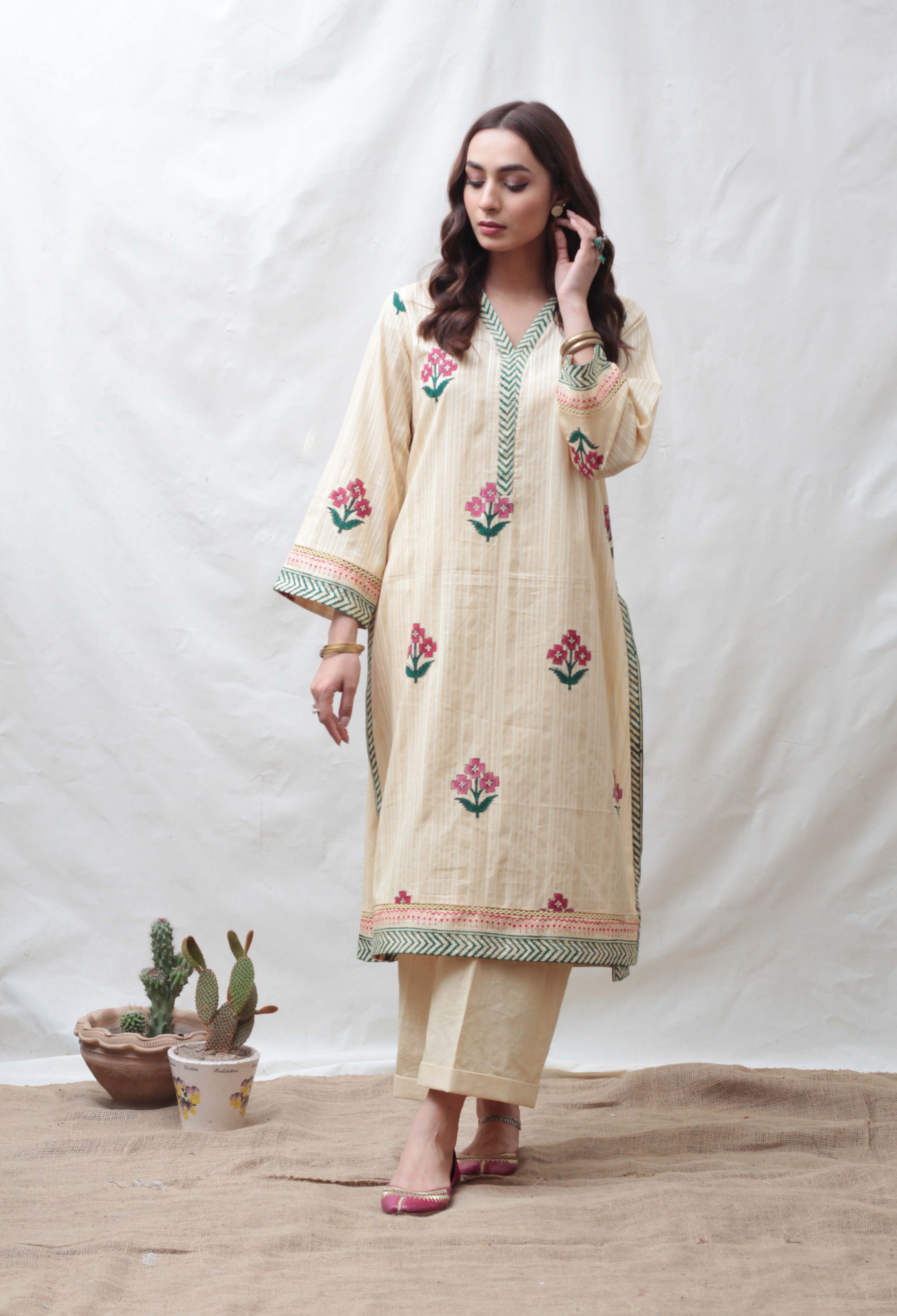 Self-lining beige lawn shirt, hand blocked with love all over the shirt, hem, sleeves and neck paired with a plain lawn flowy trouser.