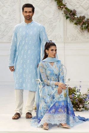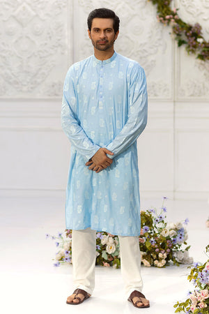 This soft powder blue kurta is designed with tonal embroidery and full sleeves. It’s paired with white straight trousers, completing the clean and fresh look.