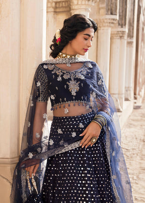 This classic lehenga choli silhouette is cut from korean raw silk in a royal blue color.The choli is hand embellished with traditional materials like zardozi, nakshi, threads and crystals and is paired with mirror lehenga with a tilla worked border.The look is completed with a tilla worked net dupatta.