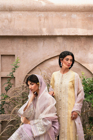 Introducing the "Aaraish" ensemble from the much-anticipated Din Mein Khwaab collection by the inimitable Mohsin Naveed Ranjha, crafted with opulence for Eid ul Azha. This resplendent creation is a symphony of lilac and off-white hues, rendered in sumptuous Italian silk. The shirt is a canvas of Mughal-inspired motifs, masterfully embroidered to evoke the grandeur of an imperial past, while delicate decorative trims add a touch of regal finesse. The ethereal organza dupatta, adorned with embroidered corner motifs, drapes with a whisper of elegance. The ensemble is completed with your choice of impeccably tailored straight pants or the timeless Azzar pants, both featuring embroidered borders and elegant trims at the hem.