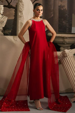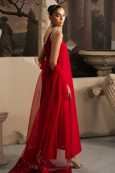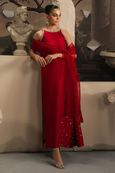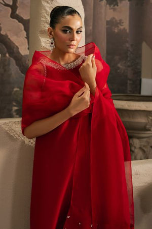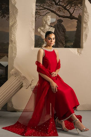 Redefining timeless elegance, Aaria is a captivating expression of chic glamour. Crafted from pure silk in a vivid red hue, the straight shirt makes a bold statement with its exquisite sequin and pearl embellishments. Paired with tailored cigarette pants and an embroidered organza dupatta, this ensemble exudes sophistication, ensuring you stand out at every special celebration.