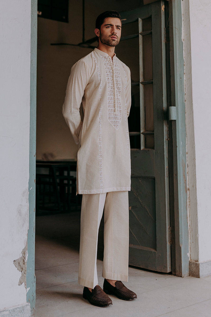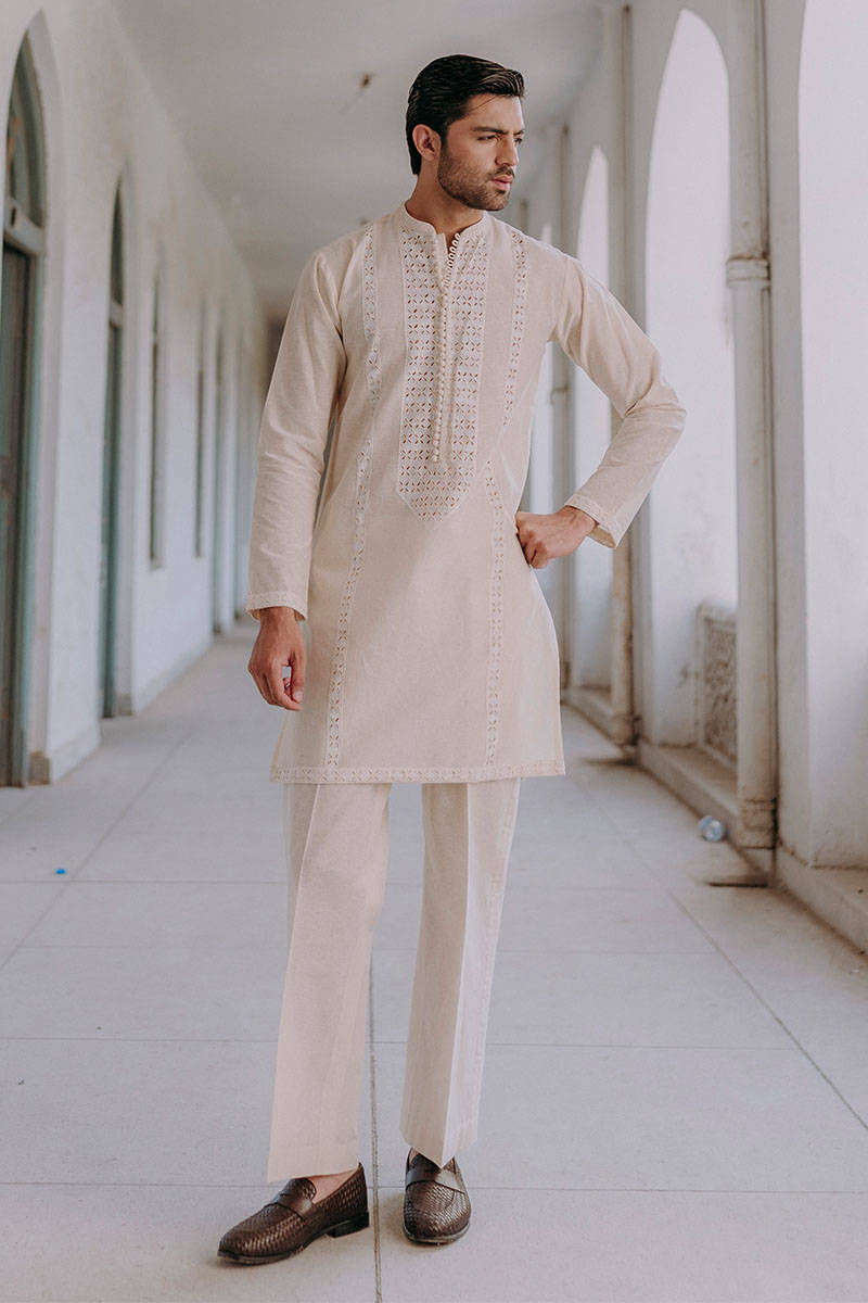 A karandi kurta, clean in cut and restrained in palette, carries embroidery along the neckline with loop-button closures that add a quiet texture. Paired with minimal trousers, it’s a confident, no-frills approach to Eid dressing.