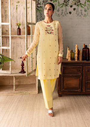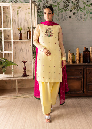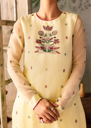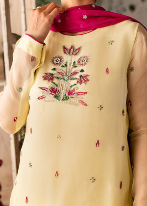 Abeer, This subtle Lemon yellow set comes with a wide shalwar and short shirt,adorned in flagrant hand embellishment on neckline mixed with sequins, naqshi and Katdana. The beautiful floral bunch on front completes the look. Paired with embroidery and sequin dupatta.