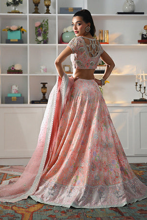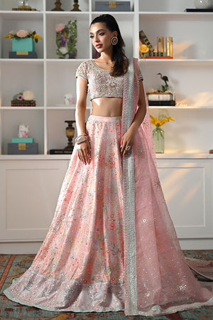 Sprinkle in diamonds in our tea pink raw silk lehenga choli. This exquisite ensemble showcases a digital print in soft pink hues, adorned with delicate sequins, pearls, gota, cut dana, and Swarovski stones. The choli features a stunning cutwork back, adding a touch of allure. Paired with an organza net dupatta, highlighted by digital print borders and intricate embellishments, this outfit is every girl’s dream.