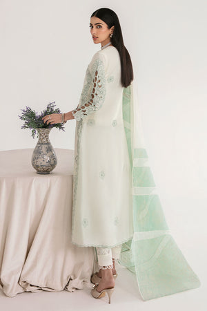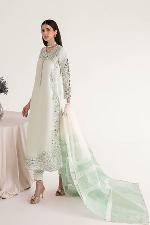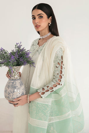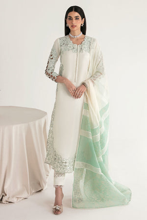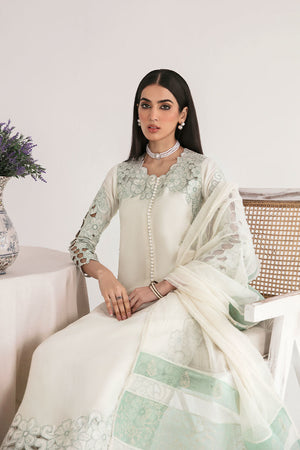An ivory raw silk straight shirt with heavy embroidered cutwork details beautifuly composed all over the shirt and sleeves with scalloped edging and sleek straight cut button down neckline. It is paired with straight raw silk pants and a coordinating block printed cotton net duppata to complete the look.