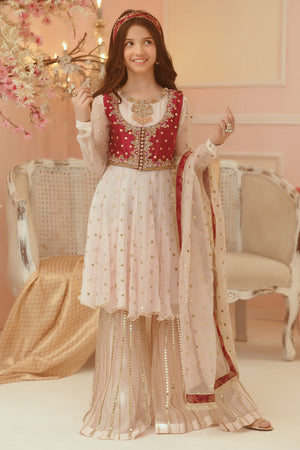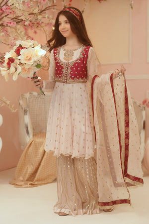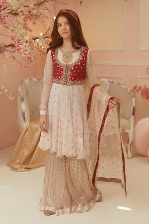 Premium Chiffon Peplum having embroidery details of zari and sequins, embellished with handwork of zardozi, crystals and sequins styled with pure silk jacket embellished with handwork of kora dabka and sequins. This article is paired up eith embroidered net gharara...