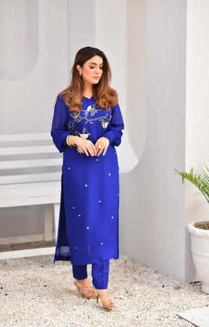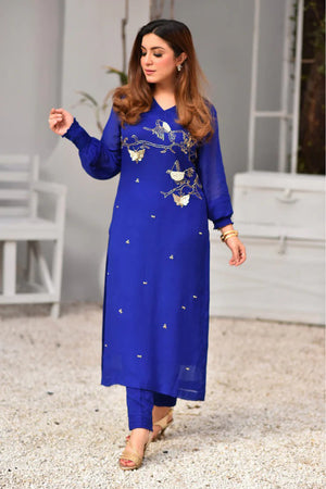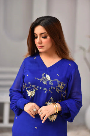 Deep blue crepe chiffon with elasticated sleeves and pleated pant . Hand embroidery on long shirt in combination of cut- daana, pearls, sequins and tilla. An elegant outfit for all your evenings with perfect bling factor.