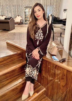 Description: Pure Crepe Silk suit. Kashmiri taanka embroidered shirt with beautiful motifs and patterns all over the shirt. Comes with scalloped pant