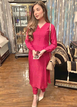 Description: Pure Loom Net Shirt in hues of perfect maroon with hand embroidery using mirrors , sequins and tilla. Comes with embroidered scalloped pant for perfect monotone look.