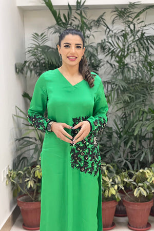 Pure green silk 2 piece ensemble having embroidery at front and back sides and sleeves in sequins, resham , tilla, pearls, 3D butterflies , statement pieces. Paired with plain matching pant. A perfect outfit with rich look.