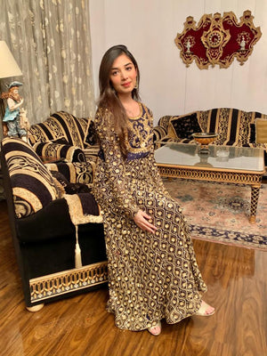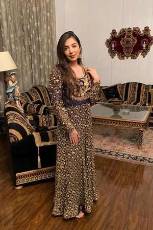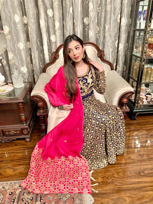 Dark Blue kalidaar, a perfect festive wear comes with hand embroidered silk bodice and sequins embroidered chiffon kalidaar with pop of puffiness underneath for perfect look. Comes with choreedar sleeves and finished off with laces and gold tissue. Paired with flapper pant embellished with laces. Could add on contrasting embroidered chiffon Dupatta colour blocked with gold tissue.