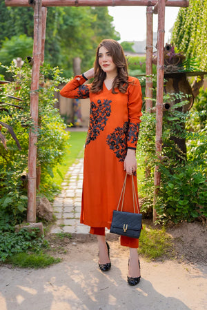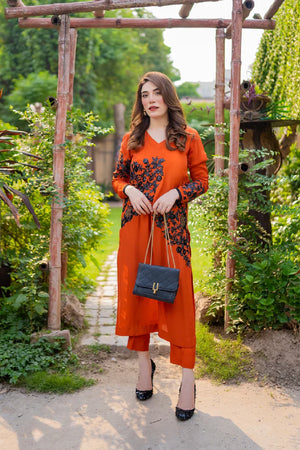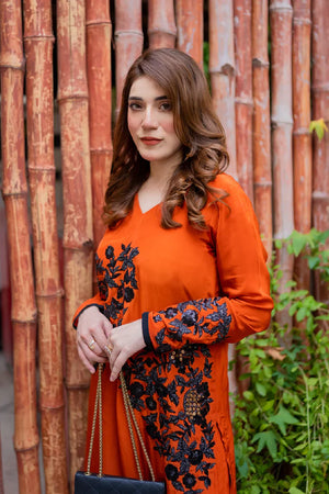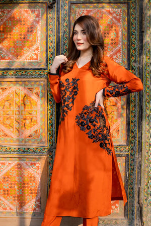2 piece pure crepe silk tangerine article with black embroidered branches on sleeves and front in resham and sequins work topped up with matt gold studs. Stitched to perfection with great fall of fabric. Comes with matching separates.