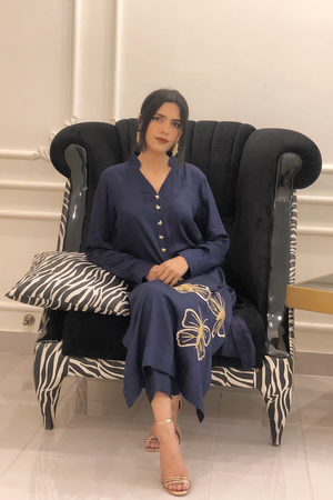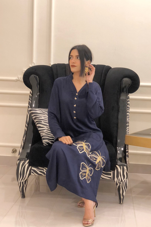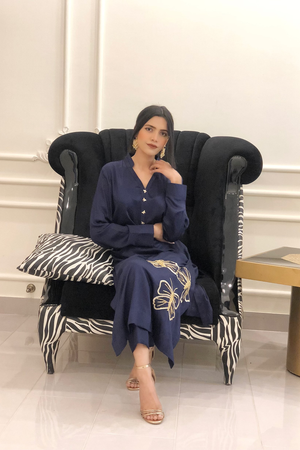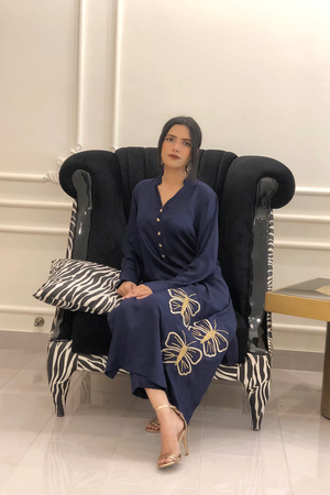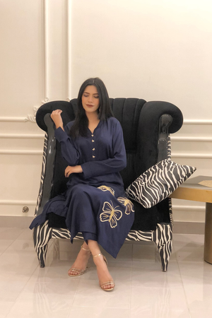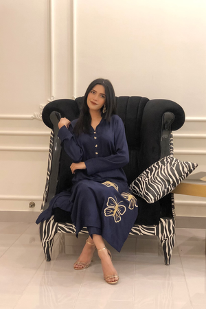 Deep navy pure fabric with sheen . Two piece set with 3 statement embroidered butterflies in different mediums. Neckline is embellished with 3D butterflies. A perfect wear for all year round.