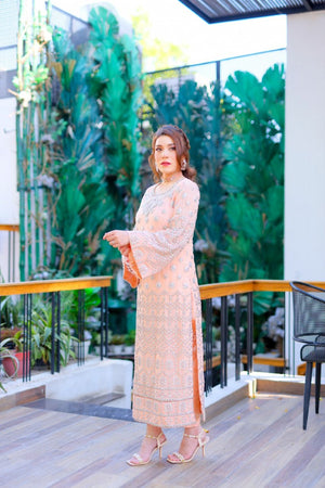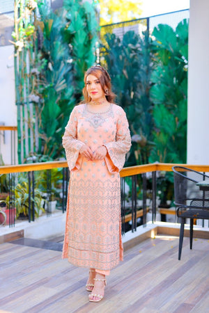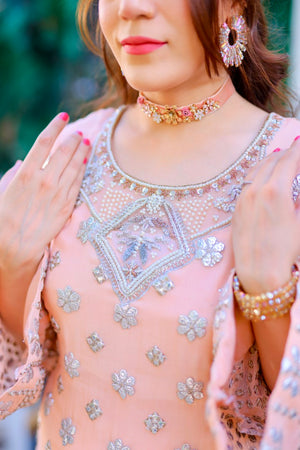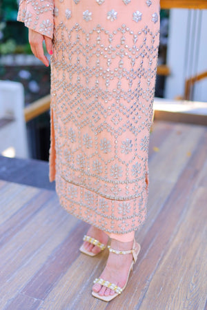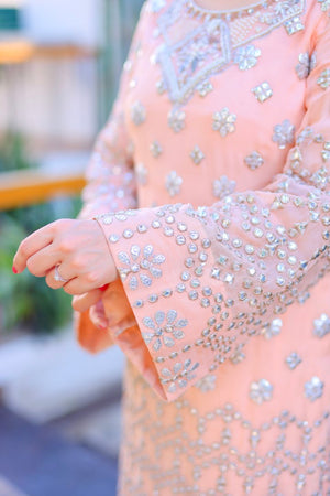 Peach 2 piece chiffon formal wear with perfect glitter and glam. Embellished with intricate hand embroidery. Comes in longer length with beautiful cut and baggy sleeves. A perfect outfit for all your special events.