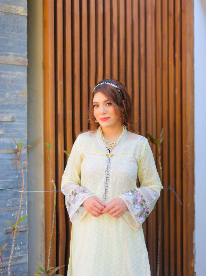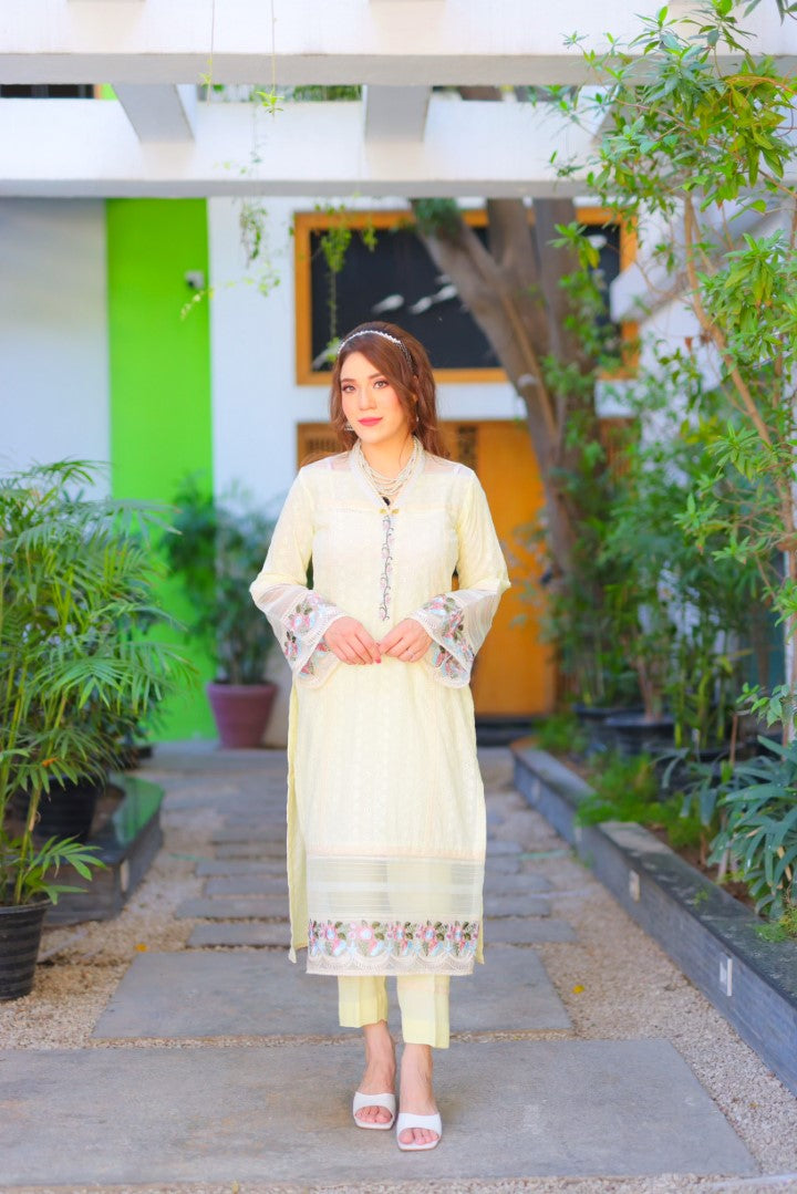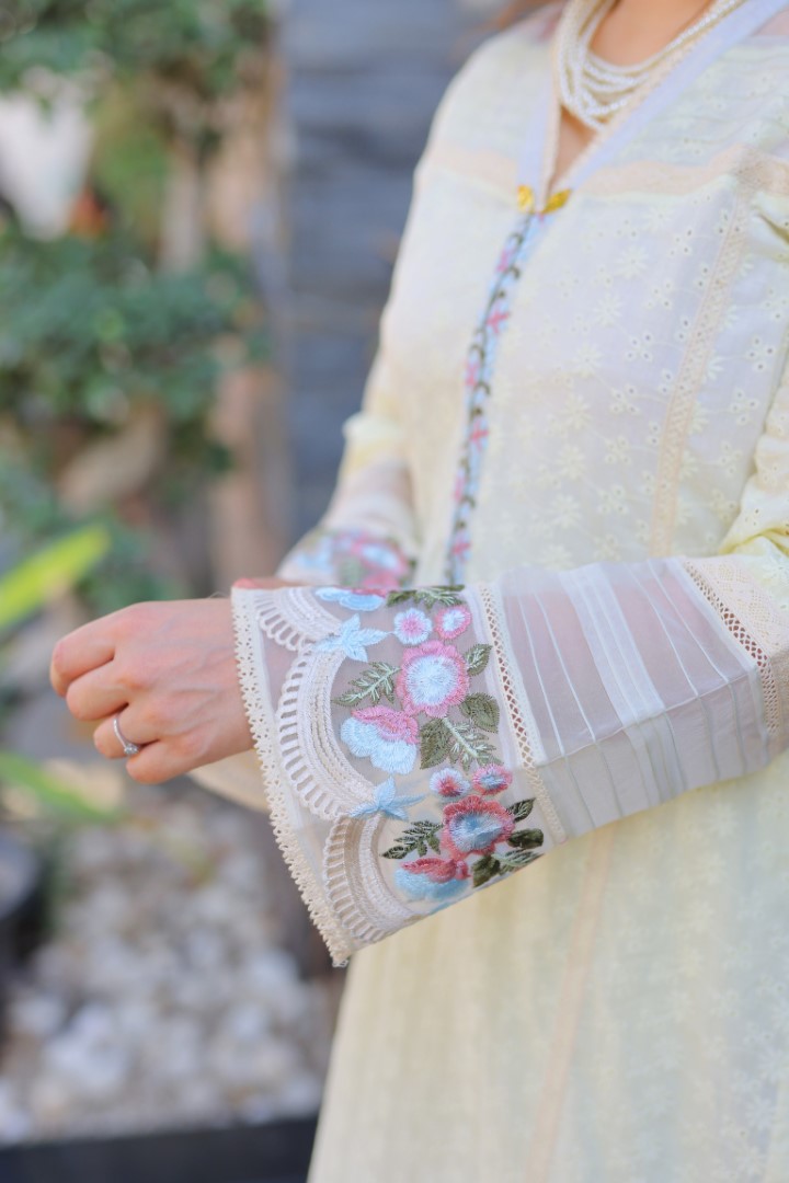 2 piece chicken lawn ensemble embellished with multicolored embroidered and beautiful laces. Trimmed with organza pleats and finished off with metallic leaves. Comes with lace embellished matching pant.