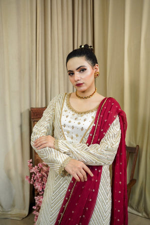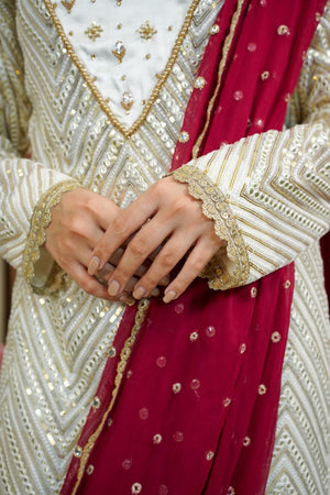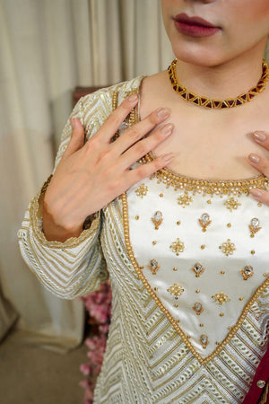 Heavy mesh embroidery in symmetrical pattern on dirty white chiffon in long length . Embellished with intricate hand embroidery on fill up style neckline. Comes with stitch in saree drape style using maroon embroidered chiffon. Finished off with beautiful worked edges and gold scallops. Back has a beautiful cut out pattern. Paired with off white pant.
