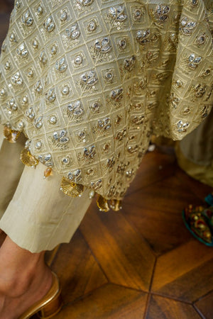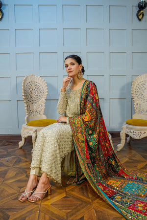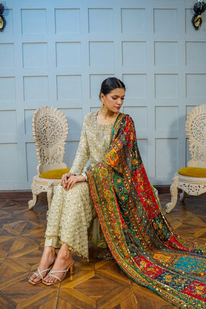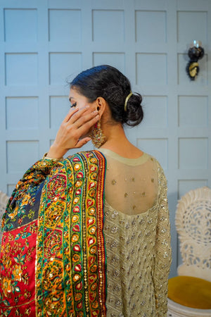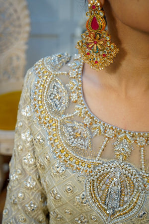 2 piece nude chiffon article with perfect sparkes and glitters of heavy embroidery at front, back and sleeves. The shirt is further jewelled with crop cut hand embroidered neckline at front and back. Finished off with silk, pearls, beads and gota hangings. Pure shamoz silk screen printed hand embroidered Dupatta could be added on for additional cost for final look.