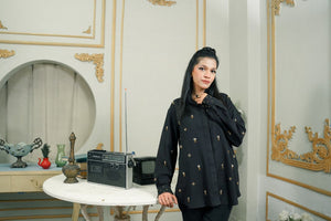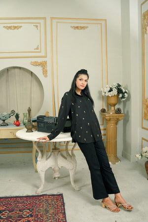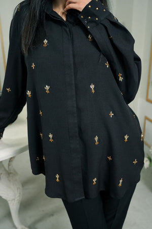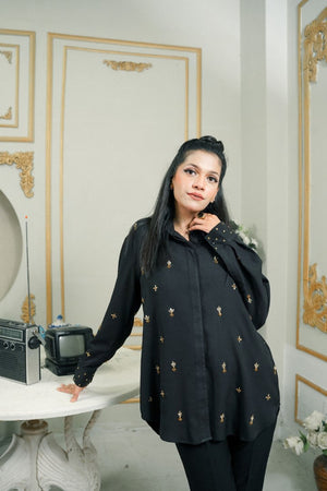 1 piece western cut top in black crepe embellished with hand embroidery on front and sleeves to make a perfect western wear with fusion touch.