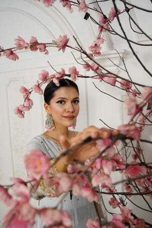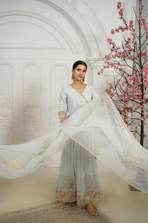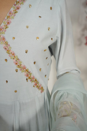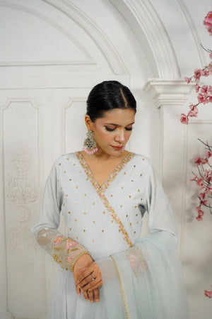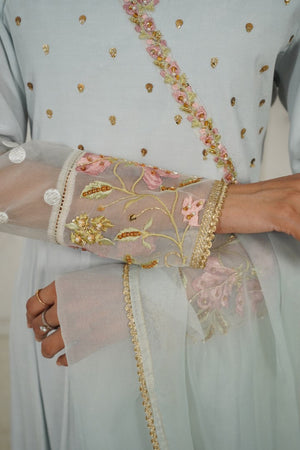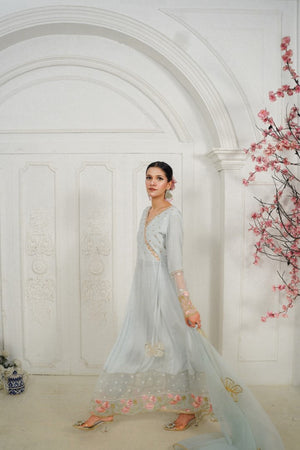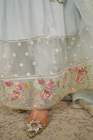 Ice blue dreamy festive outfit designed to perfection for all your special occasions. Flared crepe frock with hand embroidered bodice and multicoloured mesh for neckline. Sleeves and daaman have beautiful multicoloured floral embroidery. Comes with embroidered organza inserts on daaman and sleeves. Edging with gold lace detailing. Finished off with hand made butterfly tussles. Paired with matching tone organza Dupatta with hand made butterflies spray and gold edging. Also comes with a matching crepe pant.