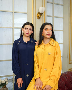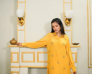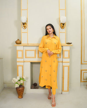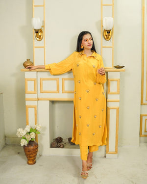 Mustard crepe set with smart casual cut. Embellished with hand embroidery on entire shirt with cutdaana, pipes, sequins and beads. The outfit has perfect drape with collar cut neckline and pleated cuff sleeves. Paired with matching separates.