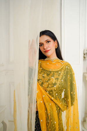 Mustard organza Dupatta with beautiful embroidery in antique and scalloped embroidered edges.