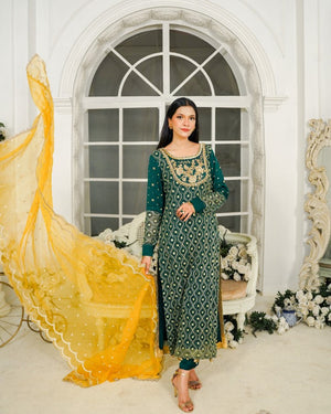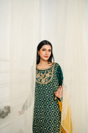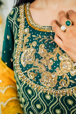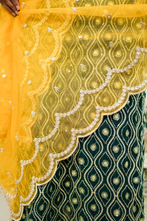Gorgeous green chiffon outfit. Shirt is fully embroidered with sequins and tilla work. Insert neckline is hand embroidered in beautiful gold elements. Sleeves comes with embroidered spray. Finished off with pearls, beads and gota petal hangings. Paired with matching separates. Contrasting mustard Dupatta could be added for additional cost.