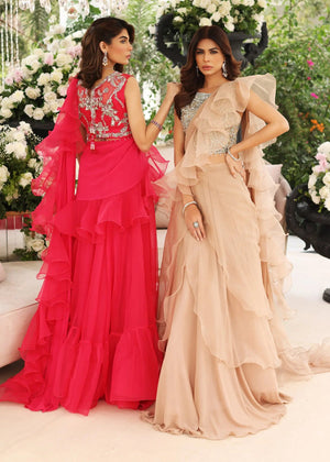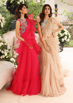 Description: Look chic with this stylish organza draped saree paired up with heavily embellished blouse.
