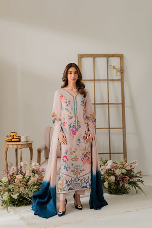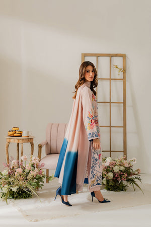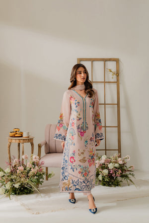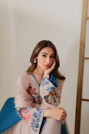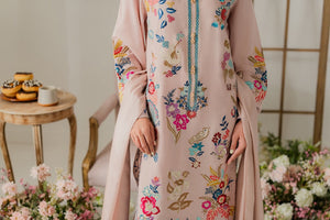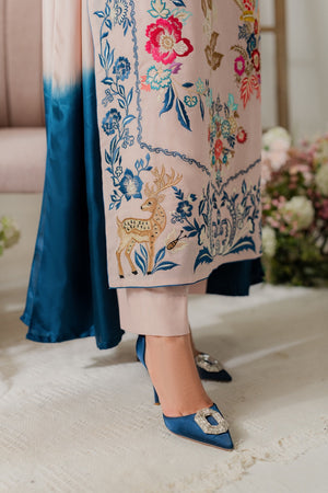 This graceful powder pink two-piece showcases delicate hand-machine embroidery all over the shirt, featuring our signature vibrant bird and deer motifs. The intricate detailing adds a unique and elegant touch. A two-toned silk dupatta is available separately to complete the look.