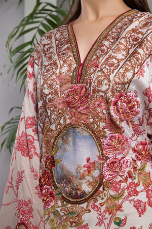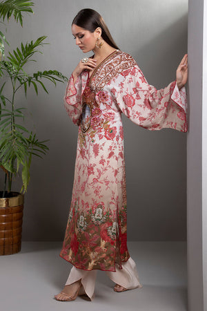 Beautiful flowy original Shamaeel's kaftan silhouette delicately stitched in silk fabric. It features layers of beautiful original Shamaeel prints. Precisely handcrafted floral embroideries and enhanced with sitara work paired with ivory pants.