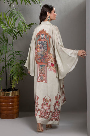 Original in-house long A-line easy breezy silk tunic with asymmetrical hem line. Hand worked floral embroidered motifs and antique gold outline. It is paired with unique straight pants.