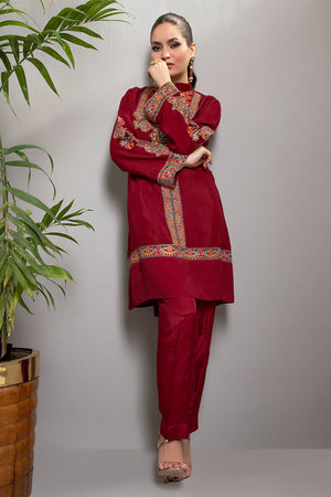 A traditional Shamaeel's silhouette on a beautiful maroon canvas made on silk fabric. Handcrafted heavy embroidery all over inspired by traditional Turkish art. It is paired with maroon cigarette pants.