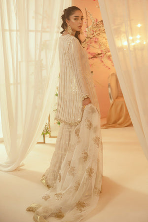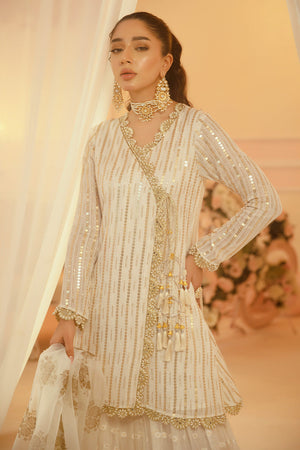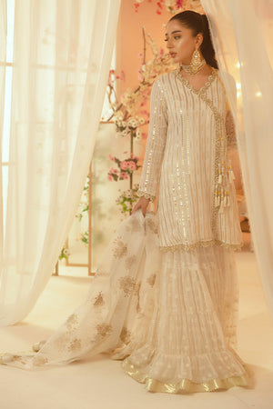 Premium Chikankari Chiffon angrakha embellished with laces and tussels paired with cotton net sharara it comes with lace detailed gold rosette motif block printed dopatta. Shipping time is 4 weeks
