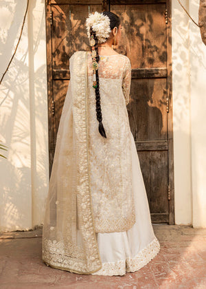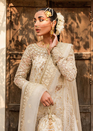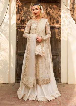 A long paneled shirt with a heavy adda work neckline, border, and constructed sleeves is ornamented with gold embellishments that softly shimmer on the ethereal ivory organza canvas. To enhance the ensemble, it features silk sharara with an exquisite extensive border to complement the outfit. A dupatta made of organza completes the look by adding substantial border embellishments.