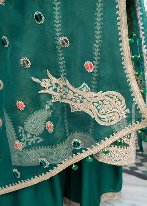 A festive favorite. An emerald, green self zarri net kurta is adorned with intricate antique gold marrori work. The formal ensemble is paired with pure organza heavily worked dupatta. Paired with a stunning worked azaar. This piece is a timeless wardrobe classic.