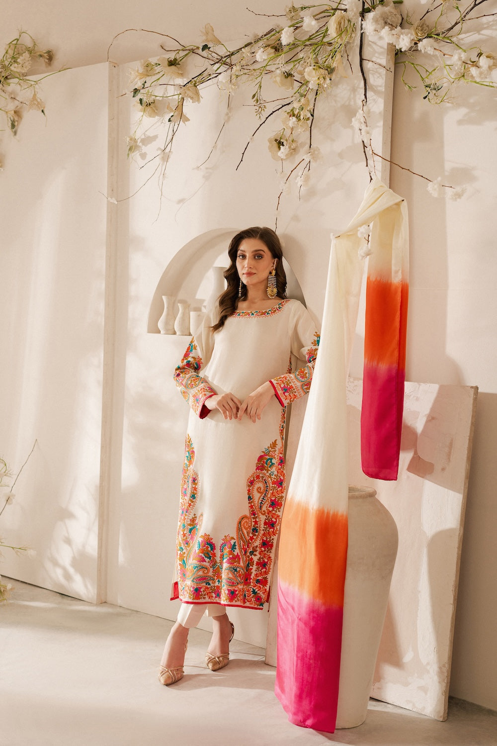 For the woman who was born for the spotlight, this piece is a flamboyant celebration in premium rawsilk. This glamorous ensemble with a structured fit offers the perfect silhouette and elevates its grandeur in tonal embroidery and elegant details. It is a stunning work of art with complete hand-worked detailing. All in all a head-turner in any party!
