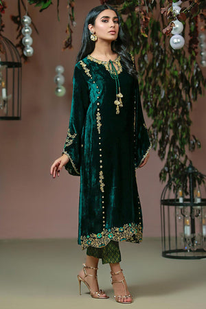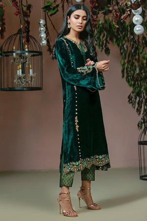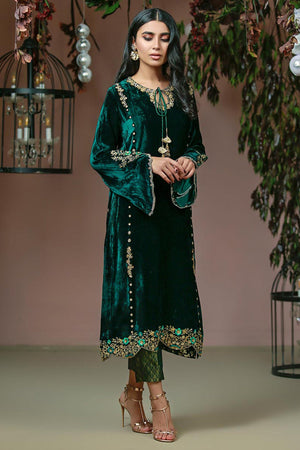 Emerald green velvet kurta with a Hyderabadi neckline, gold dabka and Swarovski trellises complimented by a zari, Resham, and sequins scalloped daman border. Paired with emerald green Jamawar cigarette pants.Fabric: Velvet