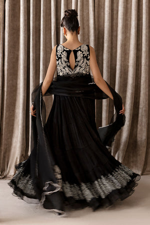 The Ultimate must-have black and white for this winter season. It has flattering silhouette in pure black velvet bodice and medium silk combination of pure organza and medium silk.