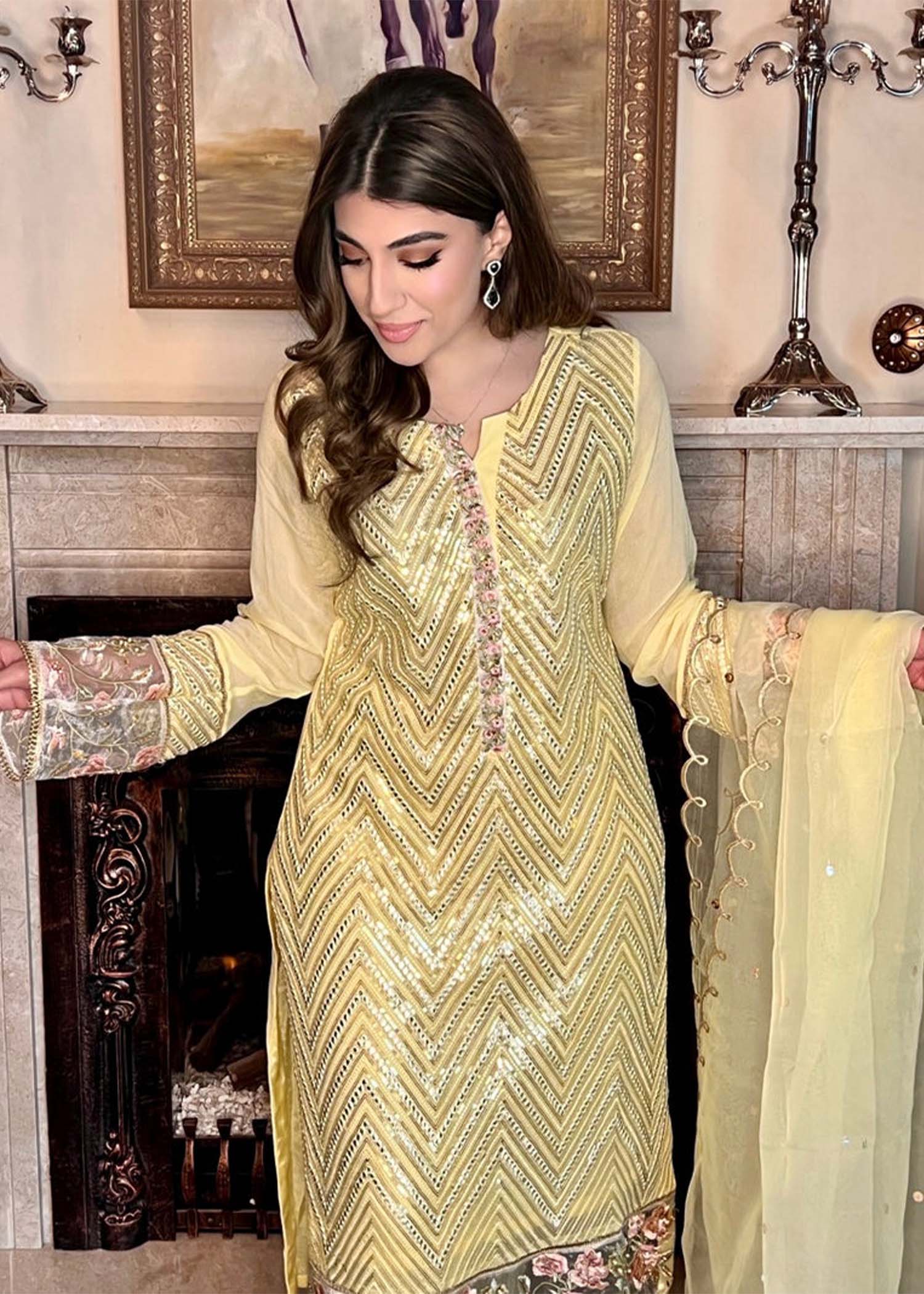 Description: Lime chiffon with diagonal embroidered patterns all over. Neckline, daaman and sleeves border comes with beautiful hand embroidery with resham, pearls , sequins , cutdaana, 3d pieces and crystals. Paired with plain trouser.