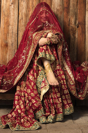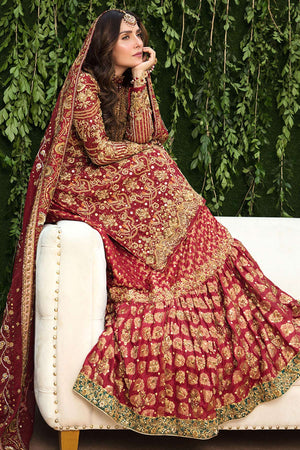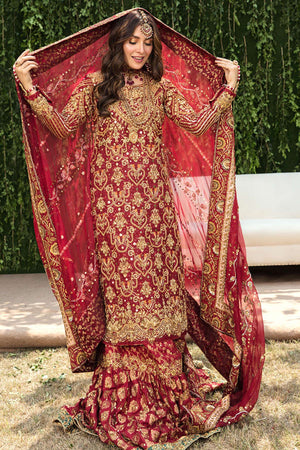 Cardinal red dabka laden cotton net shirt with mukesh, zardozi, and pitta work. Paired with a one-tone farshi gharara with emerald green borders. Alongside net organza heavily worked dupatta with salmon borders.Fabric: Cotton Net