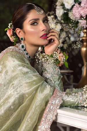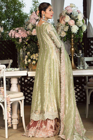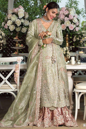 Lichen green metallic Swarovski infused angarkha paired with a shimmer blossom pink gharara with appliquéd borders and a worked dupatta.Fabric: Cotton Net