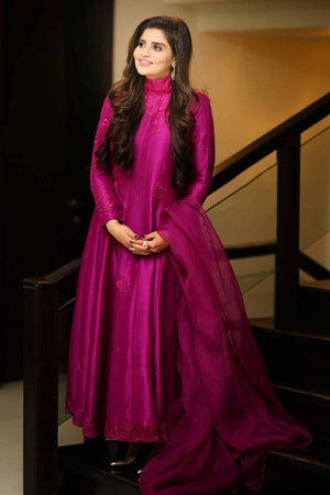 Magenta pure rawsilk self on self kalidaar paired with an organza dupatta and straight silk pants.Collection: New Arrivals