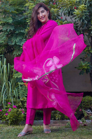 Magenta pink raw silk structured straight shirt with straight pants paired with an in house hand painted dupatta.Fabric: Raw Silk