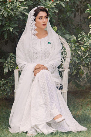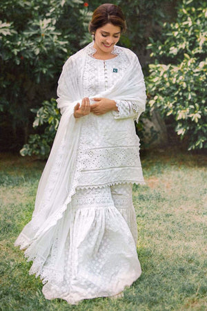 A traditional white Chikan Kurta with borders and laces. Paired with embellished chikan gharara pants & net dupatta. (The pattern/laces details may vary).Fabric: Chikan