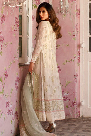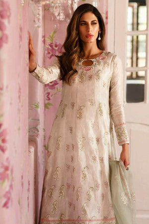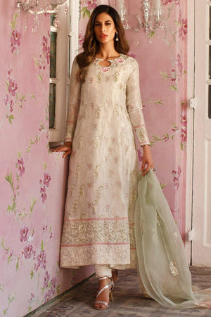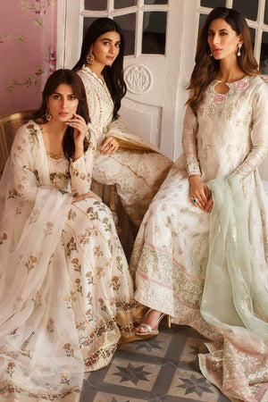 White hyderabadi anarkali on shimmer cotton net with pastel block printing. Paired with a powder pink and mint ombre block printed dupatta.Fabric: Cotton Net