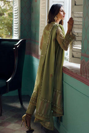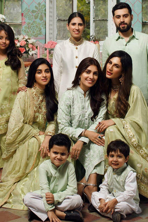 Mint cotton netblock printed shirt with gold dabka booties. Paired a silk block printed dupatta.Fabric: Cotton