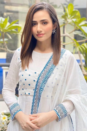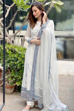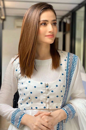 Sana Javed looking absolutely gorgeous in this white pishwas. It is meticulously hand embroidered paired with white churidar and dupatta to complete the look.Color: White