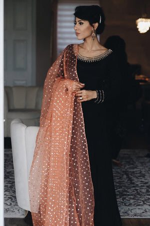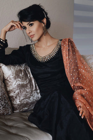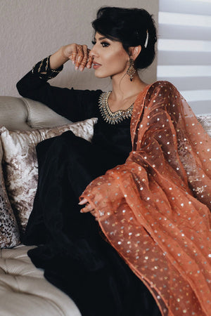Black mirror worked Pakistani raw silk kalidar paired with Dhaka pajamas and a cantaloupe sequined organza dupatta.Fabric: Raw Silk