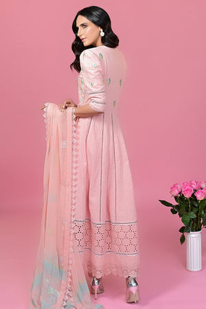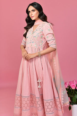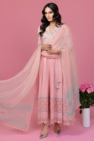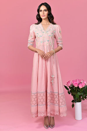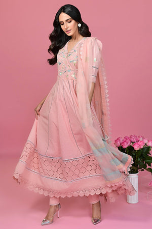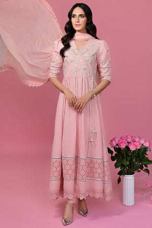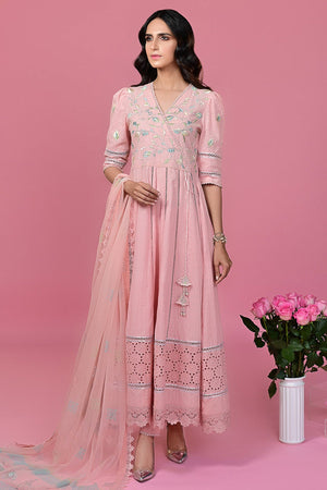Puffy sleeved powder pink chikan angarkha with festive pastel detailing. Paired with chikan pants and a chiffon hand block printed dupatta.Fabric: Chikan
